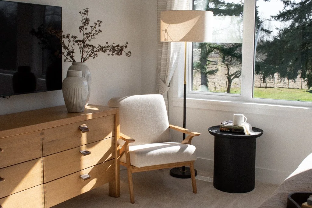 Perched high on Burke Mountain, The Ridge Residence commands a presence that matches its scenic setting. Our scope here expanded beyond curated furnishings to include refined applied mouldings that enhance the home’s architectural character. The flex room was envisioned as a dedicated space for connection, anchored by a piece with a unique story: a bespoke sofa we custom-designed to recreate a beloved profile that was no longer available on the market. This commitment to specific, meaningful details sets the tone for the home, where comfort and customization take precedence.