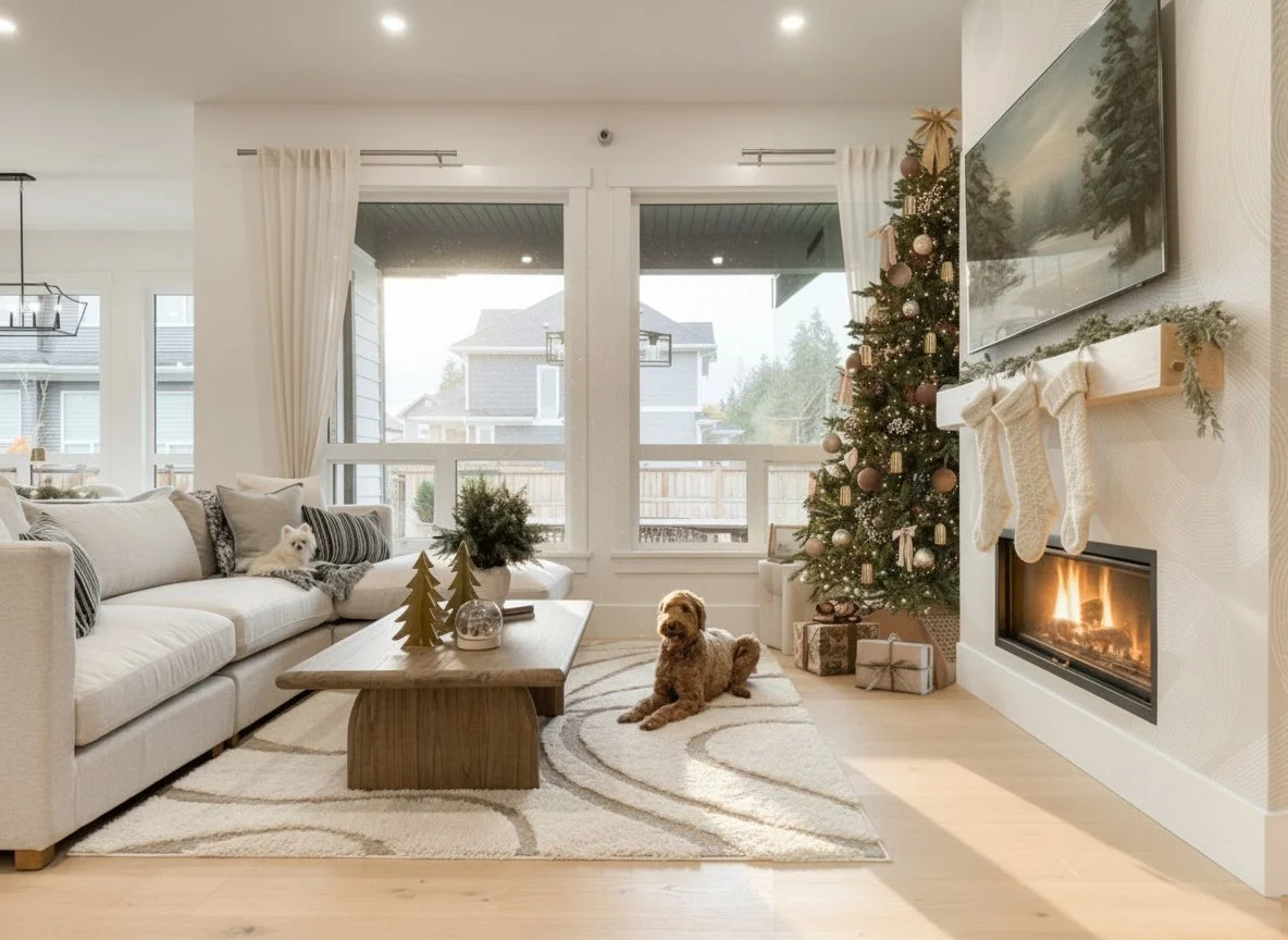 This Transitional Comfort home in Brookswood Langley brings a fresh, cozy approach to Christmas styling, merging clean modern lines with warm, approachable details. The kitchen features crisp white cabinetry and a sage green island that grounds the space, while simple greenery and festive accents introduce a layer of holiday warmth without overwhelming the design. A sweet cameo from the family pup adds personality and charm, reinforcing the lived-in comfort that defines the project. On the counter, a sketch of Santa paired with a minimal wooden tree creates a nostalgic but refined vignette—proof that even small touches can bring big seasonal character.