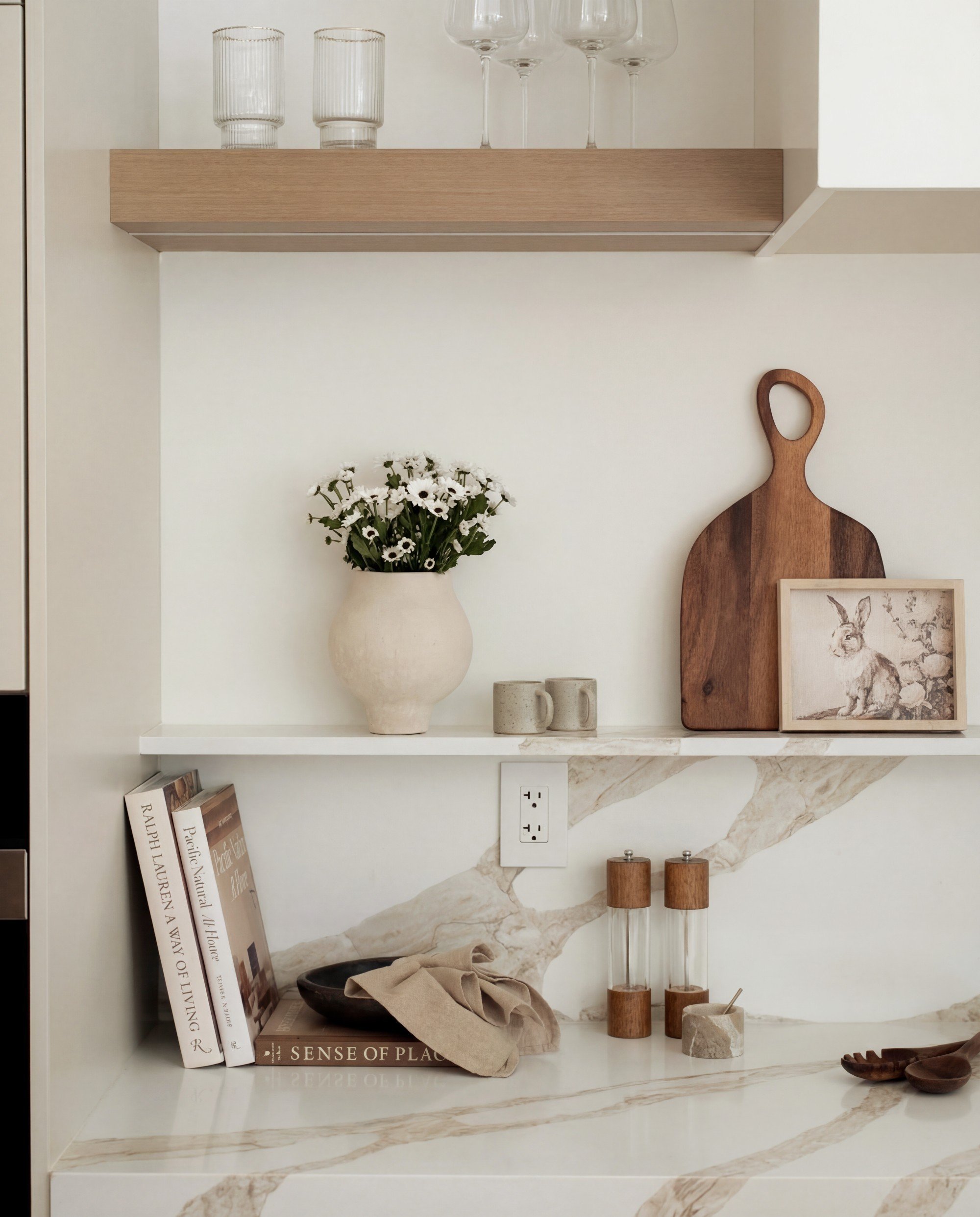 Seasonal references are appearing in quieter ways. Rather than introducing decorative pieces that feel separate from the room, small elements are integrated into everyday surfaces. In this kitchen vignette from our Atelier Chêne project, the reference is minimal. A framed rabbit illustration rests beside a wood cutting board, while a simple ceramic vase holds fresh blooms. The objects sit comfortably among books, ceramics, and kitchen pieces already present on the shelf.